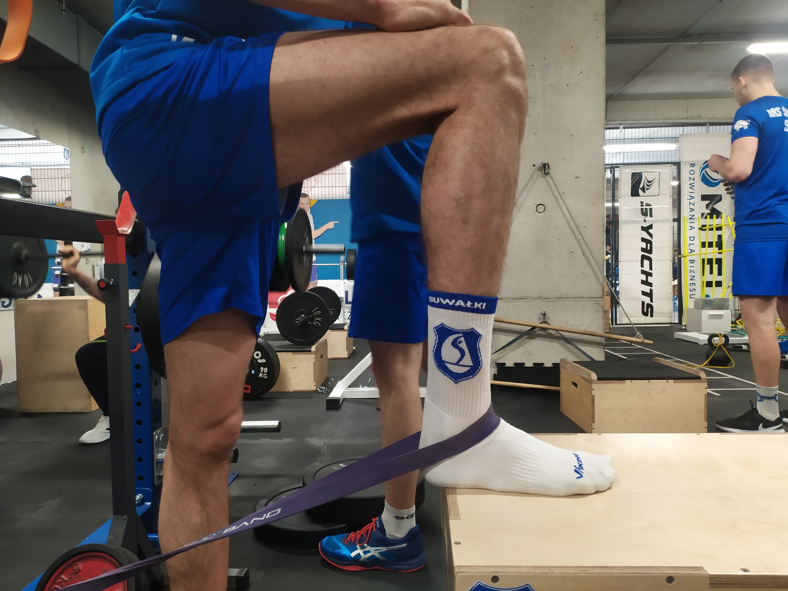 Pw. Stopa ustawiona na podwyższeniu, guma zaczepiona za ćwiczącym oraz na śródstopiu ćwiczącego.